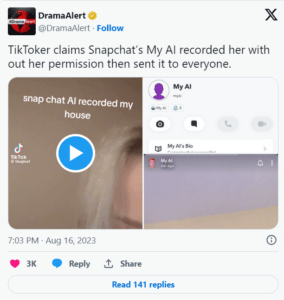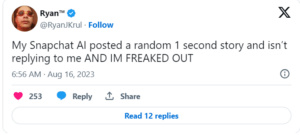 One user @RyanJKrul posted on X (formerly Twitter). “My Snapchat AI posted a random second story and isn’t responding to me and I’m upset.”