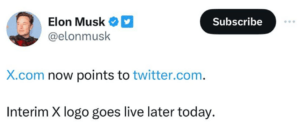 In every other tweet, Musk wrote that X.com now takes a user to Twitter.com. And that the interim X logo will move live soon.
